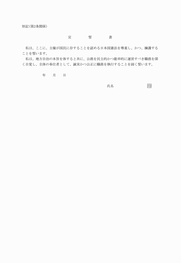 第2条 新たに職員となった者は、任命権者又は任命権者の定める上級の公務員の面前において、別記による宣誓書に署名してからでなければ、その職務を行ってはならない。