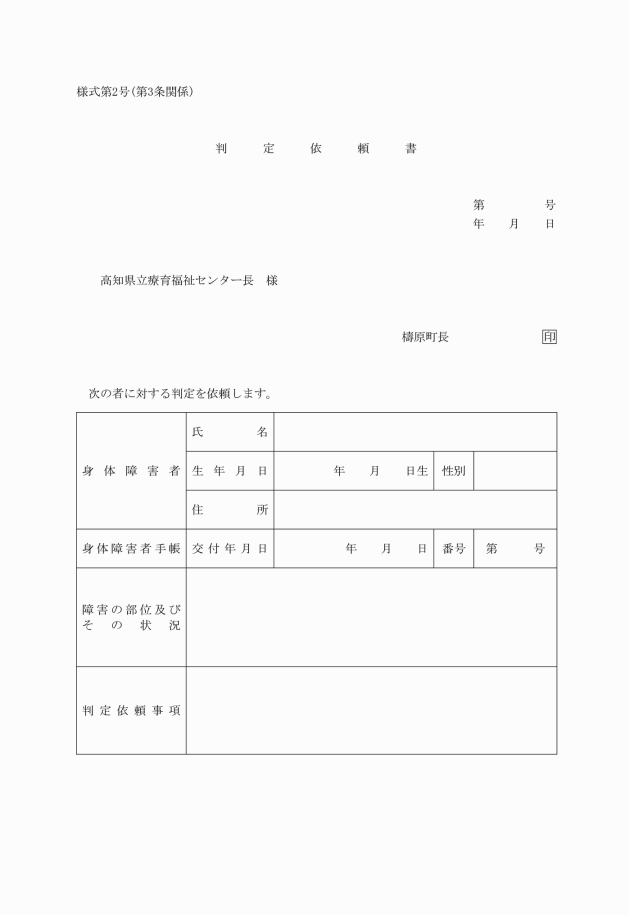 第7条 町長は、法第18条第1項の規定による障害福祉サービスの提供若しくは提供の委託を行おうとするとき、又は同条第2項に規定する障害者支援施設等への入所若しくは障害者支援施設等若しくは指定医療機関への入所若しくは入院の委託を行おうとするときは、必要に応じ、療育福祉センターの判定を求めなければならない。
